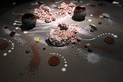 Krug on the Moon - this is something I had heard about and decided to order in advance. Normally done in the Krug Room next door, I must say that this absolutely blew us away. The staff cleared our table, then laid down pieces of silicone to cover the entire table top. This was then used as the "canvas" for Uwe to paint and create the dessert right in front of us.