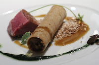 Duck: Welsh, Rhug Estate, organic, Gressingham, foot, "spring roll", natural jus - I've been avoiding eating any duck since the arrival of the giant Rubber Duckie, but that came to an end tonight... The breast of the Gressingham duck was really delicious and executed perfectly. There was some shredded "dark meat" which was stuffed into a tube, and that was pretty tasty, too. I think there was a bed of pan-fried quinoa that was kinda crunchy. Mmm mmm good.