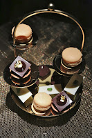 Petits fours - featuring orange blossom water macarons, pistachio and jasmine cakes with white chocolate, and chocolate tarts.