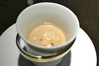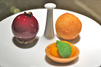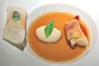 We were served some snacks, but this time around no one bothered to tell us what they were. Maybe they thought we'd had them before, so there was no need to explain. Well, I can see that we had the foie gras bon bon again, with the cherry coating providing nice acidity. Likewise there was the cheese croquette, although we thought there might have been a hint of truffle in the liquid center. The tart, though, was different from my last visit. I thought this might have been carrot purée, but there was a little bit of acidity here. The little mint leaf on top was nice.