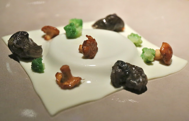 Fricassée de girolles et escargots gros gris - a royale of girolles is hidden underneath a thin layer of milk skin. Love the flavors of the mushrooms. Garnished with girolles, romanesco, and what I was told were "petit Suisse" escargots. I do enjoy my escargot now and then, and I've come across ones named "petit gris" but never "petit Suisse"...