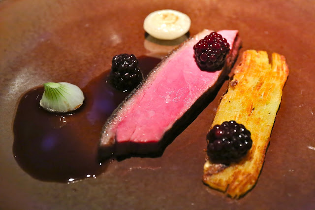 Le canard de la Maison Bergaud - a nice little sliver of Challans duck, perfectly executed. Unfortunately, the sliver was so thin (I'm inclined to use the Chinese expression of "不夠塞牙縫" - literally "not enough to fill the gap between one's teeth") that it left me woefully unsatiated. Loved the blackberries from Provence, and the pearl onion, and even the "pommes dauphine" on the side.