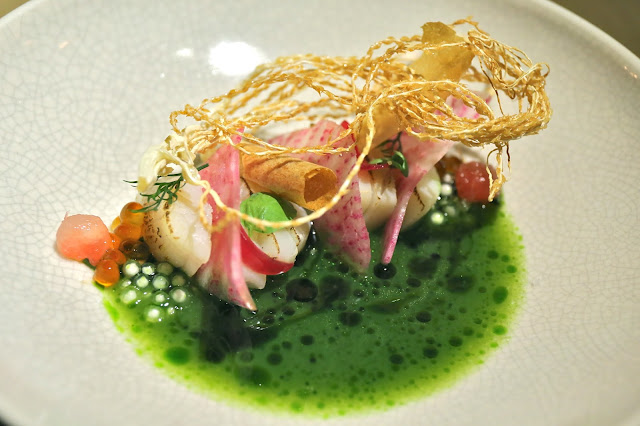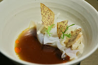 Squid, prawn head broth, smoked engawa, taro - we quickly realized that the portions here are pretty small, so we weren't in any danger of stuffing ourselves with the dishes that we'd ordered. This is the thinly-sliced squid "noodles" that I am familiar with by now, having seen similar dishes at Amber and Noma's pop-up in Tokyo. These were barely blanched, and served with flounder wings which had nice, smoky flavors (perhaps lightly torched?), garnished with crispy taro chips and bean sprouts. Served with a prawn head broth accented with some chili oil. There's a picture floating around somewhere with me holding the bowl up to my face so I could drink this stuff...