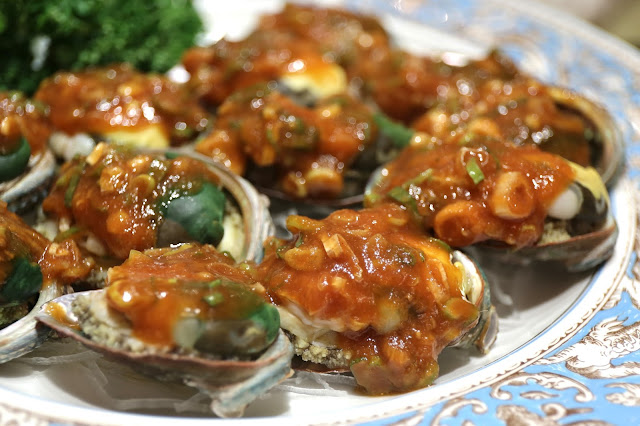 Baby abalone - steamed with a sweet and spicy sauce on top, mixed with diced spring onions and garlic.