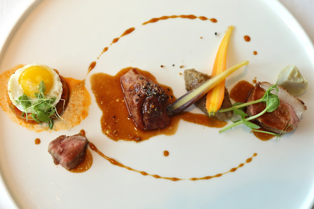 Greffeuille lamb with trappeur spices, eggplant caviar - French lamb from a famed supplier in Aveyron, with two different cuts. I loved the shank that has been cooked until tender, with rich flavors. But I can never resist lamb fat... and there was plenty of it on the piece of saddle. Nothing else mattered by the time this was in my mouth... not the artichoke, nor the quenelle of eggplant caviar, and certainly not the pile of seasonal veggies with that sunny-side quail egg on top. In fact, why was this piece of lamb saddle so dainty?!