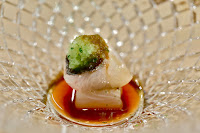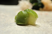Glass shrimp (白海老) - my first substitute. Garnished with a dollop of marinated bonito guts (鰹酒盗), as well as perilla (紫蘇) leaf chiffonade.