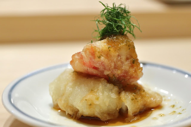 Fat greenling tempura (鮎並 天婦羅) - topped with a tomato tempura, and perilla chiffonade. The acidity here cut down the oiliness of the tempura.