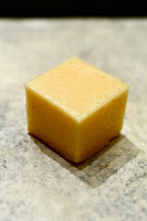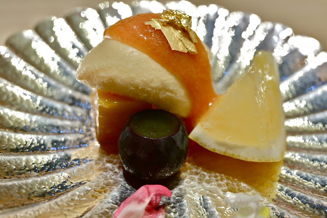 The dessert was a combination of fruits and sweets. A chunk of Miyazaki mango and a chunk of Melox (メロックス) melon from Shizuoka sat underneath some sake ice cream, which came with some peach coulis and... yup... gold foil. Besides the single Kyoho (巨峰) grape was a citrus wedge. This would be a jelly made with hyuganatsu (日向夏) citrus, with chunks of the flesh inside.