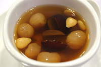 Double-boiled ginkgo nuts and lotus seeds (銀杏燉湘蓮) - a sweet way to finish our sumptuous dinner.