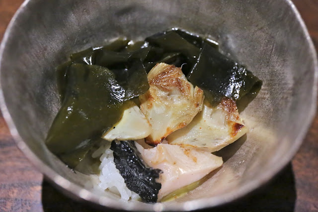 Lifting the kelp cover revealed the abalone, grilled artichoke, rice, and the liver sauce. So I guess everyone's doing abalone with liver sauce these days... Not bad.
