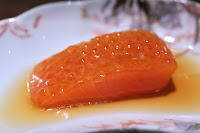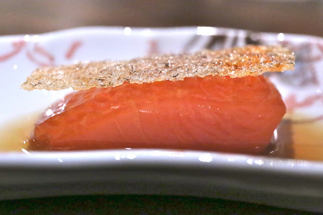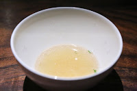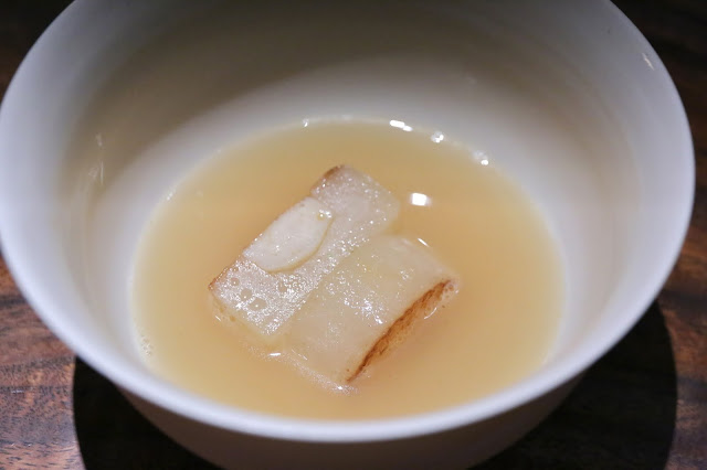 Broth of grilled roots - giant radishes stuffed with scallops and sea cucumbers, soaked in the broth of grilled root vegetables. Loved the radishes, and we were trying to figure out whether they cooked the radish separately from the "stuffing". I thought both pieces were stuffed with scallop... Oh well. Nice charring on the radish giving plenty of of smokiness. The scallop was done mi-cuit. The broth definitely tasted of dashi (出汁), but we thought there was also some butter or cream mixed in. The broth also had shaved yuzu (柚子) rind, giving it a little bit of citrus fragrance.