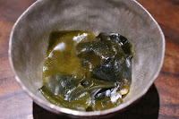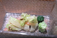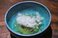 Pickles - a palate-cleanser, I guess? Preserved cucumbers with seaweed gel, topped with horseradish ice. Nice combination of acidity of the vinegar, salty flavors from what tasted like dashi, and light "spicy" flavors from the wasabigranité. Unlike Ducky, my sinuses didn't get a good clearing...