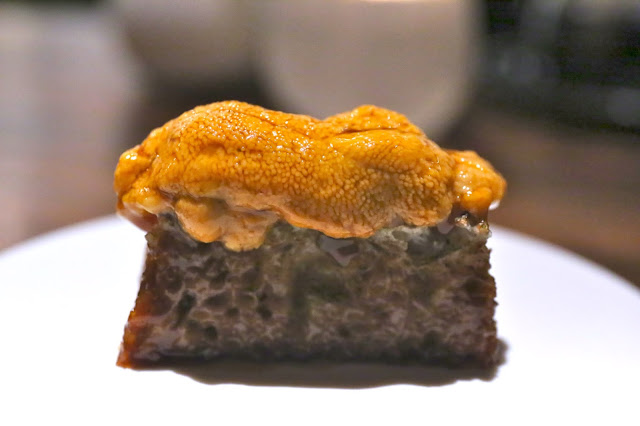 Sea urchin, liquid toast - the sea urchin comes from Santa Barbara. I could see that this was someone's favorite ingredient, and I gotta say that it was very, very good. We were trying to figure out what made the "liquid toast" underneath so delicious, with deep flavors that almost reminded us a little of Japanese marinated crab tomalley (蟹味噌). As it turns out, the secret was beurre noisette. なるほど...