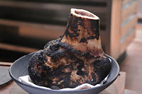 Fire in the sky beet, bone marrow, roasted over coals - Michael joked that this was their "vegan dish" while presenting the hunk of bone which has been roasting next to the fire for an hour, but he wasn't too far off the mark! First he took a spoon to scoop out the marrow from the bone, then it was heated in a little copper sauce pan...