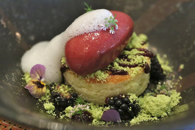 Blackberry, sorbet, buttermilk cake, lemon-verbena and pistachio "crumble" - a beautiful dessert, but I was already over the edge. I took the blackberry sorbet with the fragrant lemon-verbena foam on top, and ate the blackberries, but took only one bite of the buttermilk cake.