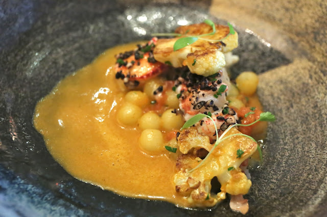 Maine lobster, puffed black rice, cauliflower and coconut curry - the lobster was mi-cuit and still pretty crunchy. Loved the classic Indian curry with cauliflower and potato pearls. The tomato salsa was a nice touch, as was the puffed rice to give some crunch. The curry was nice and tangy.