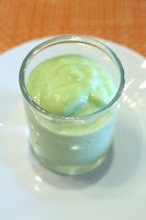 The amuse bouche was a green apple, arugula, and avocado foam. You get the sweetness from the apple plus the very strong flavors of arugula. Nice.