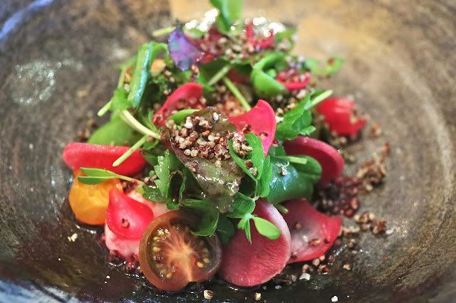 Spring pea salad, fines herb relish, snap peas, burrata and pickling juice - you've got quinoa, coriander, pea shoots, sugar snaps, watermelon radish, pickled pearl onions, and tomatoes. Then you've got the burrata. This made for a very interesting mix of textures, from crunchy to soft and mushy. I really liked having this salad to start, but the burrata made things a little too heavy... and I could feel it filling up my stomach.