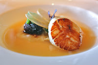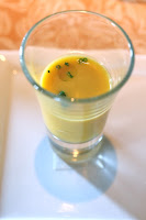 Amuse bouche was chilled ginger and carrot soup, with lemon oil and chives. There seemed to be a little cumin here...