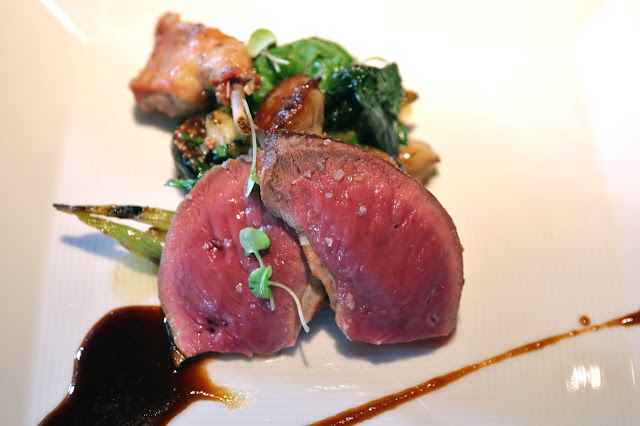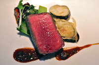 Prime beef pavé, tempura eggplant, baby bok choy, nardello peppers, Asian vinaigrette - I took the beef medium-rare as suggested, and the color certainly looked good.
