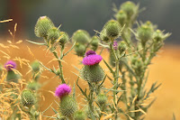 By the time I finished filming here and got back to El Capitan, the haze had drifted over. I took a few more disappointing snaps, and we drove over to another spot discovered yesterday to get look at Half Dome. Well, it wasn't completely obscured today - even worse than yesterday. So instead of taking pics of the famous rock formations, I took snaps of some flora... like these blooming thistle - which, incidentally, is the emblem for my alma mater.