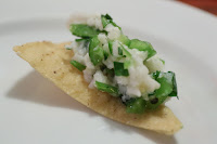 Ceviche verde bowl - done with green bell peppers, cilantro, and onions. Served with more tortilla chips and saltines (!) on the side. Pretty good.