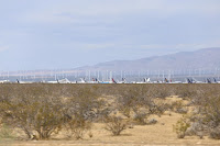 Naturally the landscape looked a little bleak, and the only thing worth noting was the huge windfarm in the area, so it was pretty boring for a while. Suddenly, I looked out the window and saw what seemed to be a collection of airplanes near a control tower. Was there an airport here in the middle of nowhere? Suddenly I remembered about the famous airplane boneyard in the Mojave Desert, and sure enough, the Mojave Air and Space Port was right here besides Route 58.