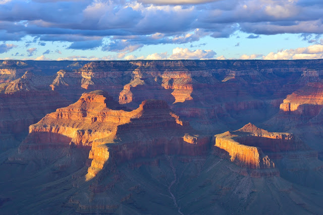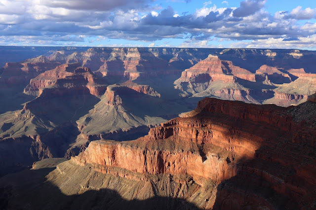 Unfortunately there were lots of low-level clouds today, so much of the canyon was shrouded in shadow. The winds were also pretty strong, which swept up lots of dirt and sand into the air - and made the sky a little hazy. Not the best conditions to produce beautiful pictures, but the view was still stunning.