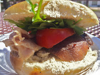 My lunch today? Slices of honey ham, chunks of Ganma's braised pork shoulder in soy sauce and five spice, arugula, and tomato in a bagel. Needless to say, the pork shoulder half of my sandwich tasted better...