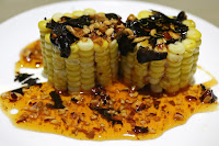 The sweet corn is actually "reconstructed" around the foie gras terrine"cob". I liked the idea and the combination, but there was a tad too much of that sticky sweet syrup.