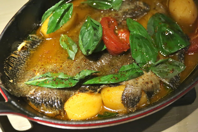This small sole didn't have a lot of flesh on it, so the ratio of bones (especially the fins) to flesh was definitely way above average - making it a little bit of a pain to eat. There was also a distinct bitter flavor here. But what little flesh there was certainly tasted very tender and silky. I was a little surprised that this was cooked in a pan with tomato and sweet basil.