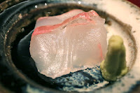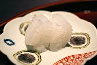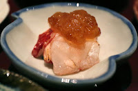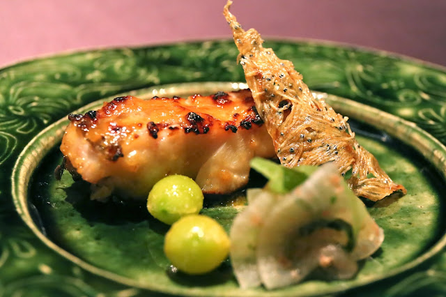 Charcoal grilled amadai brushed with miso-yuan sauce (“甘鯛” 味噌幽庵焼き) - I didn't realize that yu-anyaki (幽庵焼き) is one of the classic preparations of tilefish, and one could be forgiven for thinking it's just another "miso cod"... except that tilefish is miles and miles better in terms of flavor and texture. Served with deep-fried ginkgo nuts, a wafer of deep-fried baby sardines, and some pickled radish and seaweed on the side.