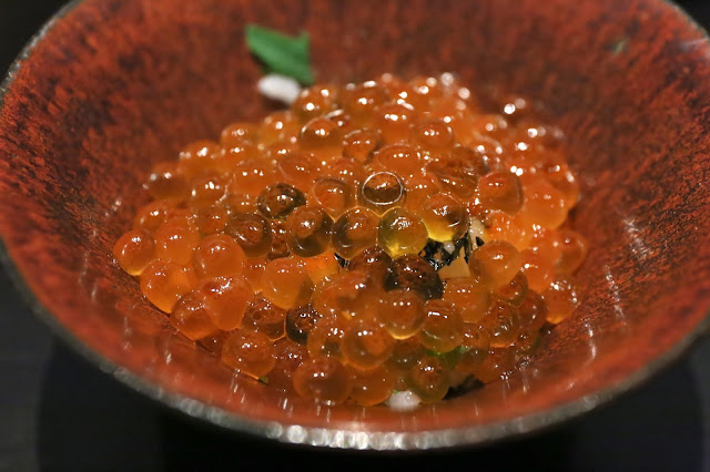 Steamed rice topped with ikura salmon roe (“新物いくら” 御飯) - salmon roe is one of my favorite things to eat, and these little pearls were very, very good. I liked the perilla leaves but the rice was simply way too mushy.