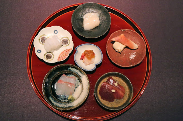 Assortment of sashimi (本日のお造り盛り合わせ) - they used to serve three different types of seafood for the sashimi course, but tonight we've got six:
