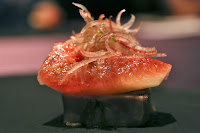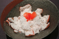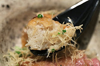 Foie gras flavored with porto and wasanbon sugar, served with fresh figs and sesame cream sauce (ポルト酒薫る 和三盆仕立ての フォアグラ と いちじく 胡麻クリーム を絡めて) - this is a dish that I first had in Tokyo five years ago. Absolutely loved it. The chunks of French foie were sooo silky smooth... and I definitely tasted the Port. The figs provided the nice sweetness and a bit of acidity to go with the rich foie, and I really liked the myoga (茗荷) strands on top. Chomp chomp. Can I have two more, please?