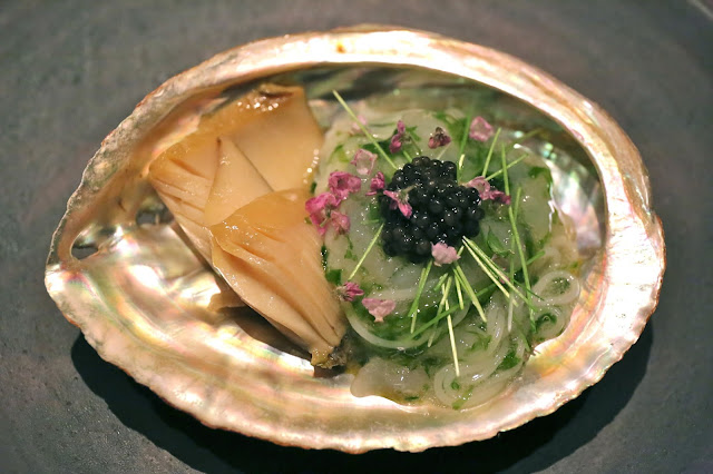 Cold noodles topped with white shrimp, caviar, abalone, and abalone liver sauce (白海老と煮鮑の冷製そうめん キャビア 鮑肝ダレ) - cold somen (そうめん) has always been my favorite way to start a meal at RyuGin, and tonight in addition to the usual caviar and glass shrimp (白海老), the chef also added slices of abalone. All of which are among Babu's favorite ingredients. Of course, nowadays everyone's also making sure they serve the abalone liver sauce. Garnished with the usual perilla flowers and scallion sprouts (芽ねぎ). So refreshing and very, very good. Babu was already happy after one course... Only nine more to go!