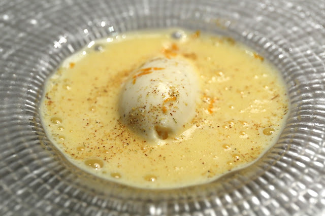 Japanese golden peach with osmanthus flower sabayon sauce - peach compote at the bottom, with vanilla ice cream, and sabayon made with orange and peach juice. Wonderful dessert, especially the shredded orange rind inside.