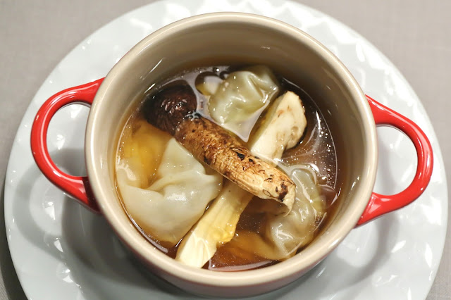 Consommé of "Lung Guang" chicken with grilled matsutake mushroom, chicken wanton - I know Sato-san and his mentor Yamamoto Seiji (山本征治) really like the Lung Kong chicken (龍崗雞) of Guangdong, so it's not surprising that this was on the menu. But it was a surprise that we didn't get the deliciously grilled chicken... and got chicken wontons instead. The chicken consommé was simply divine, helped in no small part by the presence of matsutake mushrooms (松茸). The minced chicken leg inside the wontons were seasoned with a surprising amount of black pepper, but still pretty tasty.