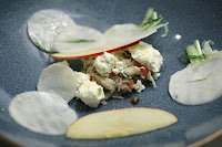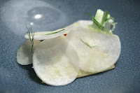 Turnip, crab meat and house made fresh cheese salad, scent of yuzu - love the look of these paper-thin wafers of turnip.
