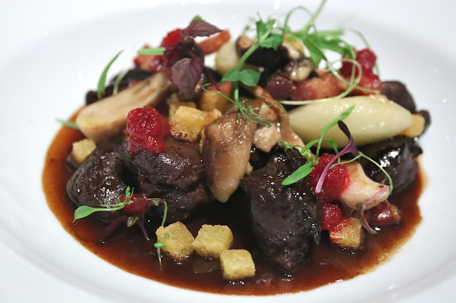 Slow braised roe deer stew, spätzle, glazed apple, cranberry, cepe, ventrèche bacon - I love game, so I didn't want to pass up the chance to have roe deer. Unfortunately the meat was too dry and tough, and braising didn't really end up tenderizing the meat when there's not a lot of sauce. The pieces with some tendon were slightly better. Love the croûtons and the cranberry sauce. For some reason I didn't particularly enjoy the ceps.