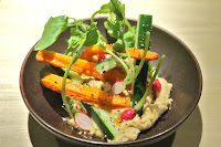 Hummus / vegetables - the carrots seem to have been roasted or dehydrated, giving them an interesting texture and flavor concentration. The hummus itself was very, very tasty... and I had to get extra bread as serving vessel to bring some more down the hatch. Those tiny baby radishes were cute and tasty.
