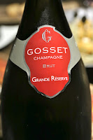 Our VIP friend told Olivier that it was Winnie the Chew's birthday (conveniently ignoring that we were also belatedly celebrating his), so Olivier very generously sent us Champagne. The Gosset Brut Grande Réserve was a little pungent, chalky, and dusty. Perhaps it was a problem with the glass? Slightly high acidity on the finish.