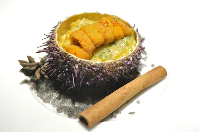 Sea urchin served in the shell, arborio rice risotto - another beautiful dish. Risotto cooked with tomatoes so the acidity helps balance the richness and the sweetness of the sea urchin... along with fresh herbs like parsley and tarragon to add a little extra to the dish. Surprises with a spicy kick.
