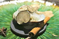 Abalone in the shell, sauerkraut and horseradish foam - a very tasty dish, and one inspired by the Alsatian classic choucroute. I had another version of this earlier this year, but this has since been refined and the bacon/lardon substituted with smoked haddock. You've got nice acidity from the sauerkraut to balance out what might have been heavier seasoning here. Very nice. And of course with more truffle on top.
