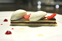 Roasted pigeon "from Racan" with turnips 5 spices, peanut and spring onions caramel - the old man wasn't used to getting the finger from a Racan pigeon, but this has been the popular presentation for the last few years... The pigeon breast was beautifully done, and while it wasn't as perfect as my favorite pigeon in town, this was still very, very delicious. Loved the paper-thin wafers of radish. The minced meat from the thigh was made into a croquette, from which the leg stuck out to "greet" the diner...