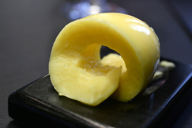 The first order of business at any meal here is... butter. More specifically, Bordier butter. The butter trolley gets wheeled in, bearing two huge mounds of my favorite French butter, as the staff asks whether we would prefer the unsalted or salted variety. The Great One put her foot down and chose the salted butter for everyone because... why would any rational person choose the unsalted version? The attending staff dutifully used two large dinner spoons to scrape several "ribbon" of butter from the mound and placed them on serving dishes... Don't these look just absolutely beautiful??