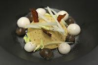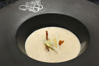 Le champignon: mushroom bouillon, foie gras royale and celery - the cone of foie gras royale was surrounded by tiny little mushrooms and topped with julienned celery as well as pieces of crispy country bacon.