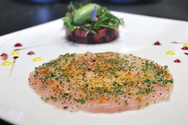 L'hamachi : yellowtail carpaccio, duo of beetroot and apple refreshed with a green mustard sorbet - an absolutely beautiful dish, both in terms of flavors and presentation. The yellowtail carpaccio had beautiful texture, and wonderfully seasoned with finely chopped chives and what looked to be piment d'espelette. The beetroot salad did not have the characteristic earthy flavors that I find objectionable, thanks to the green apple, avocado, and herbs such as dill. The bit that amazed everyone ordering this dish? That quenelle of green mustard sorbet on top of the herbs. Wow!