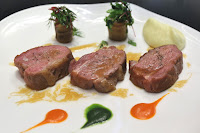 Les crevettes «Obsiblue» : shrimps with stewed Paimpol white beans perfumed with smoked haddock and piquillo - a beautiful dish full of flavors of the ocean. While the Obsiblue prawn would seem to be taking center stage, the orchestra consisting of tender octopus, smoked haddock, squid, periwinkle, lobster sausage, and Coco de Paimpol beans all contribute to make this a delicious dish. The squid ink wafers seemed to add a certain mystery to the dish by shielding some of the ingredients from view...