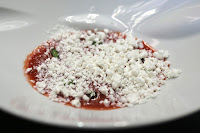 La cerise : cherry gazpacho with frozen ricotta and pistachio flakes - our amuse bouche was similar to something I've had here a number of years ago. The "regular"gazpacho was modified to include black cherries.